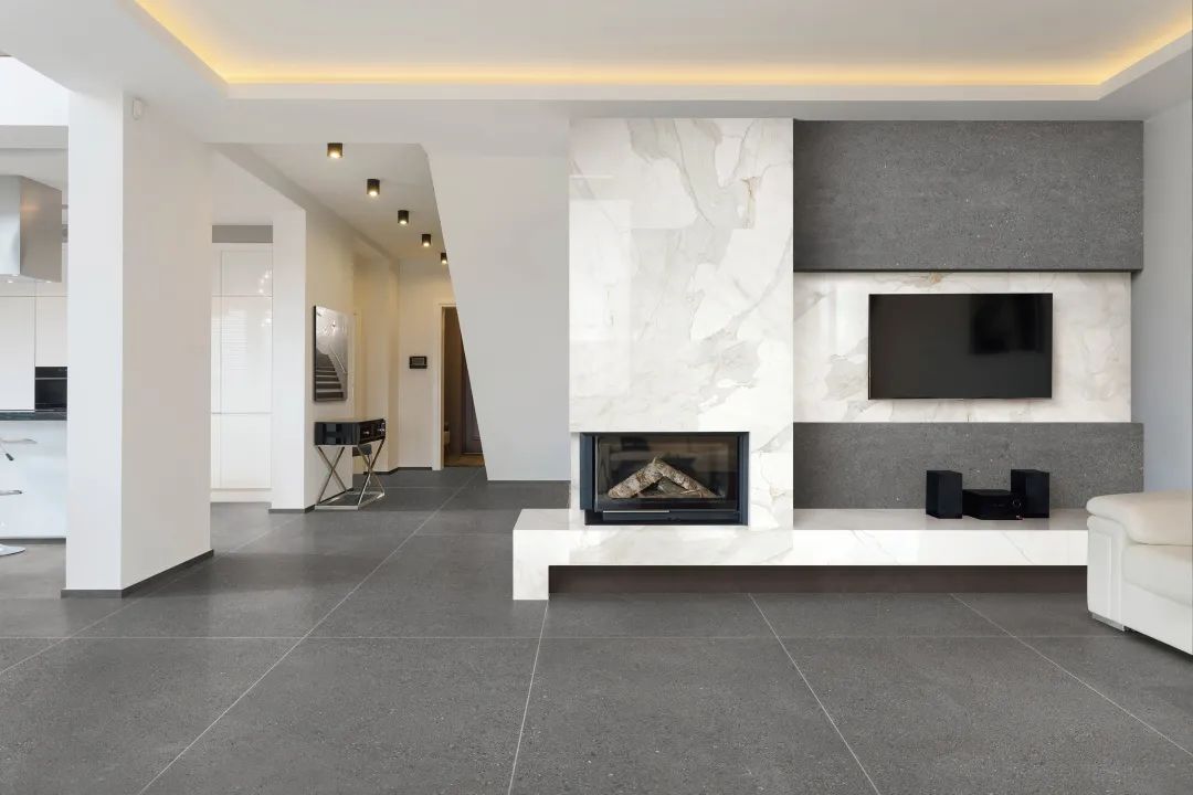 The high-end atmosphere of gray and white collocation, 750x1500 "Turkish sandstone" large slabs are spread over a large area, extending the space vision.