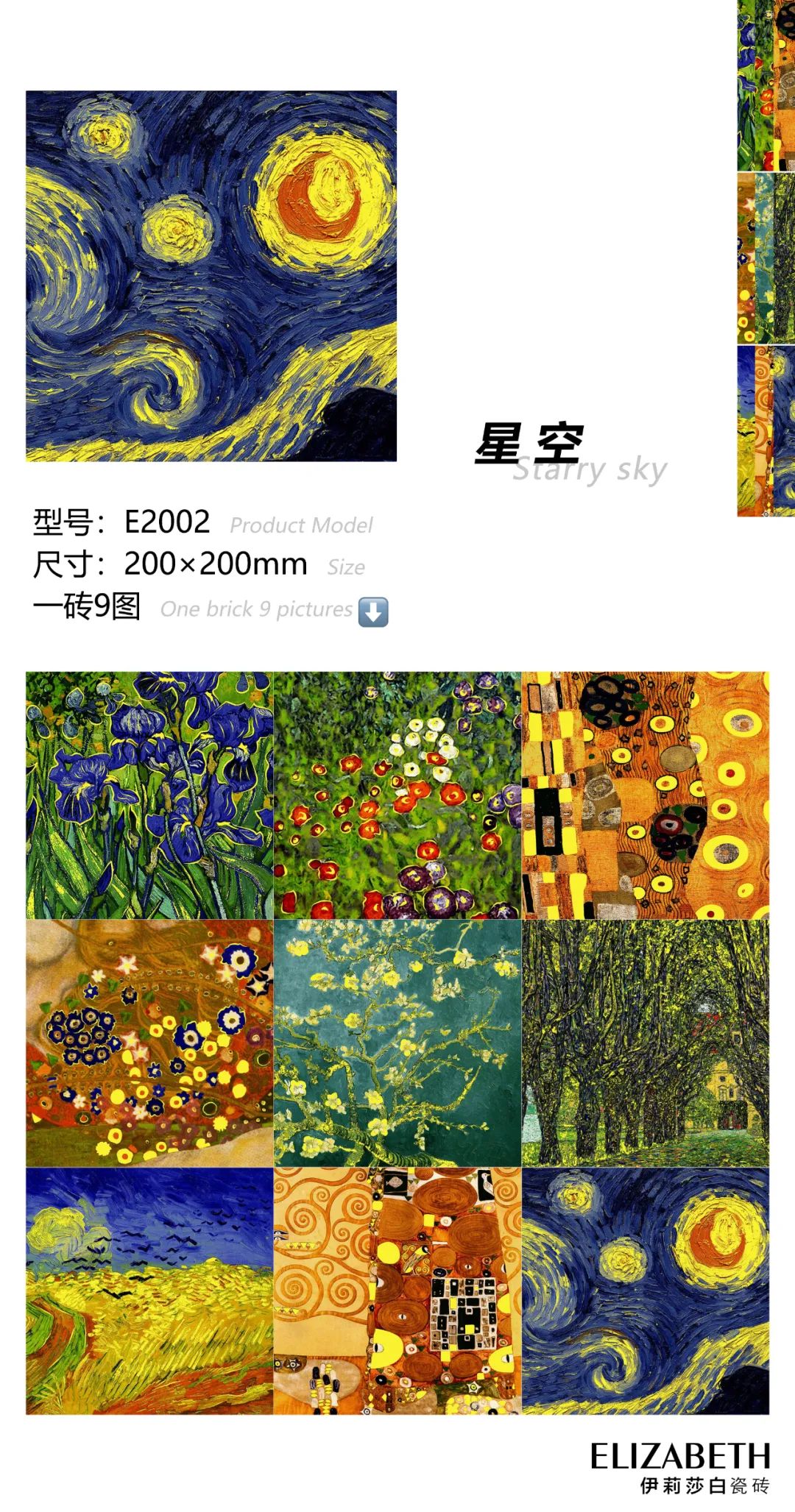 The "Starry Sky" small tiles incorporate Van Gogh's vivid colors and exaggerated painting style. The designer selected 9 very representative works of Van Gogh, one brick with nine pictures, one picture with one painting.