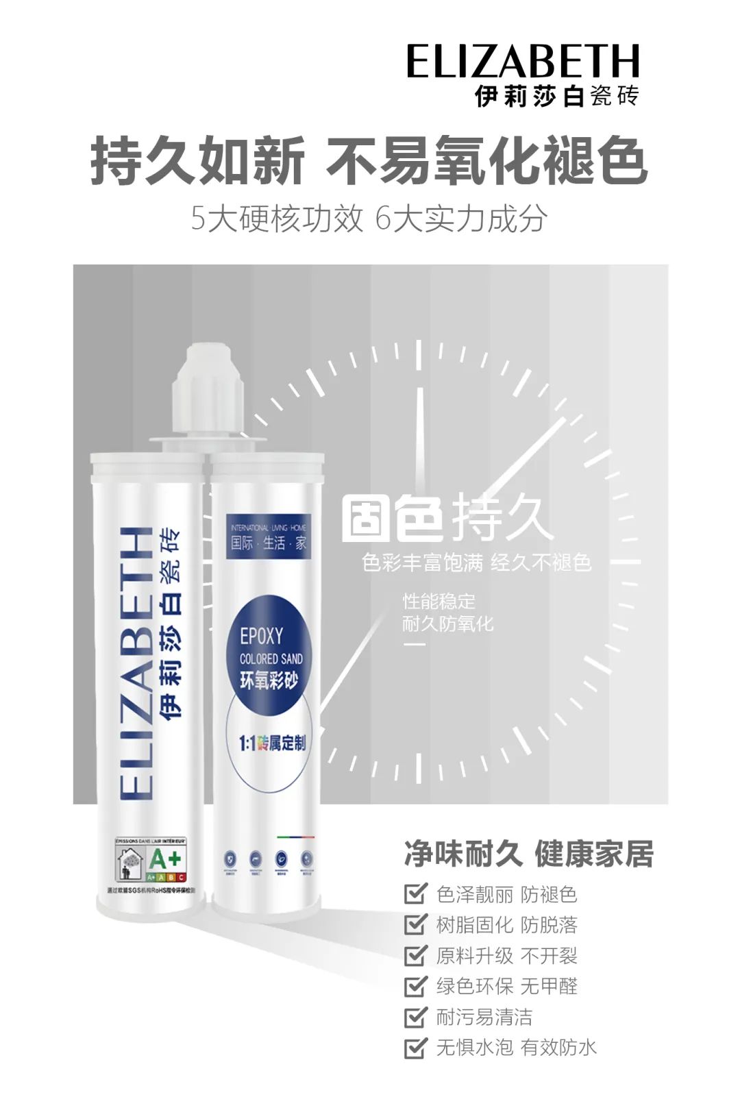 ELZIABETH CERAMICS's exclusive customized beauty joint agent (Epoxy Color Sand) is developed one-to-one based on tiles, focusing on color aesthetics, truly matching the tiles, weakening the effect of the gap, and diminishing the gap between the tiles to the extreme.