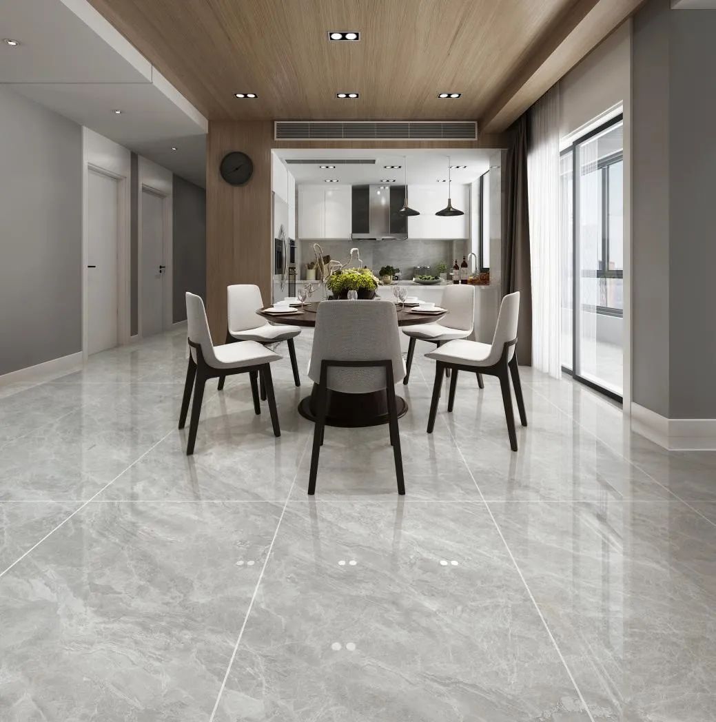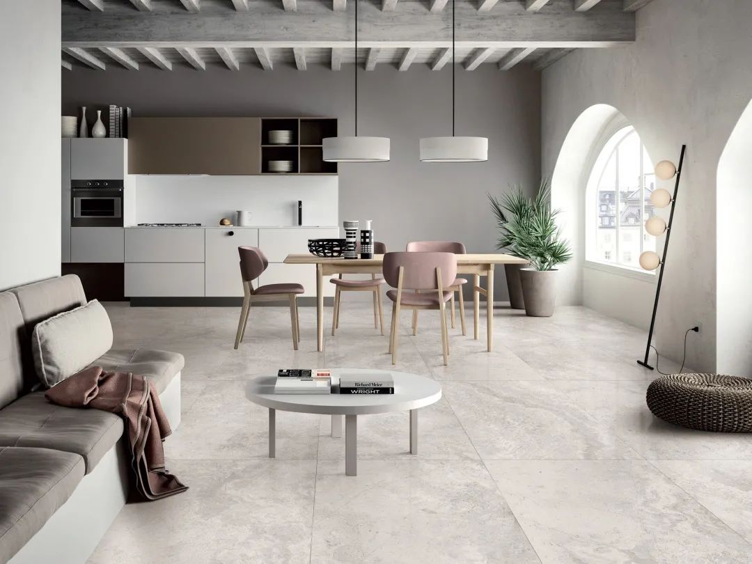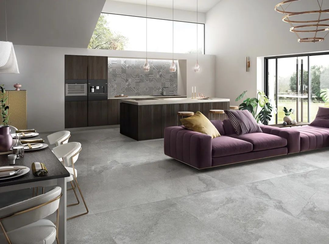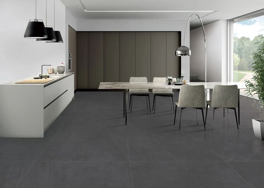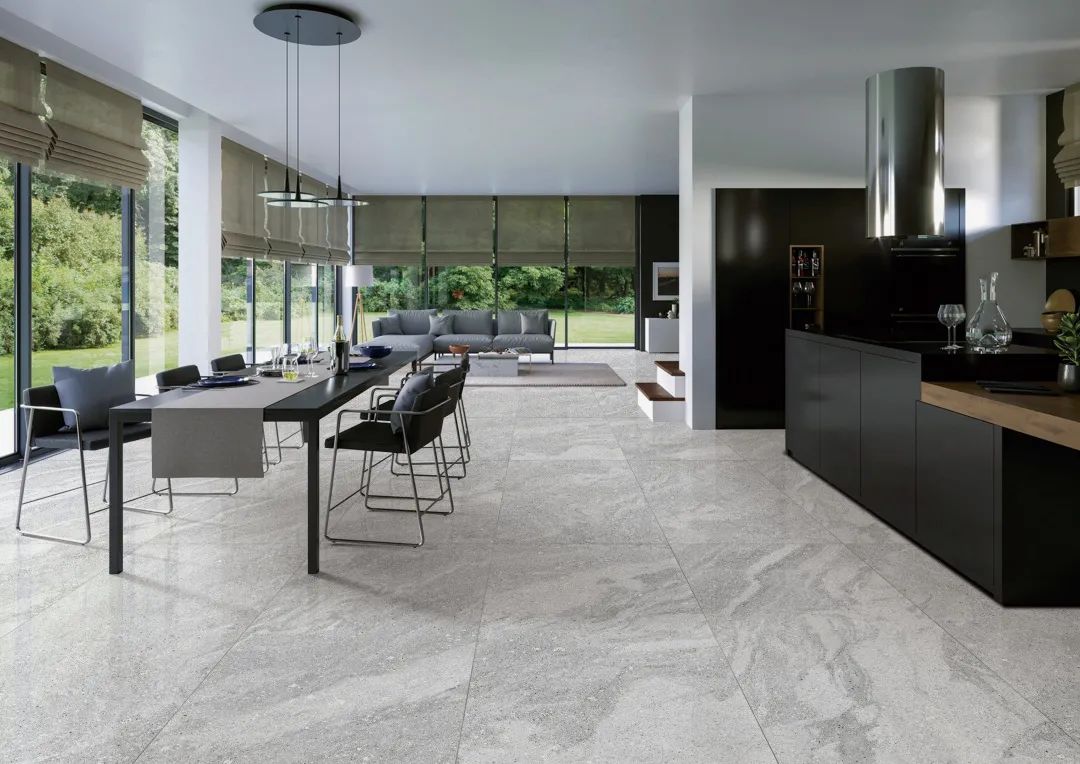 “山水砂巖”一磚8紋大面積平鋪地面,流水磚紋不動聲色地提升了空間的自然美感。